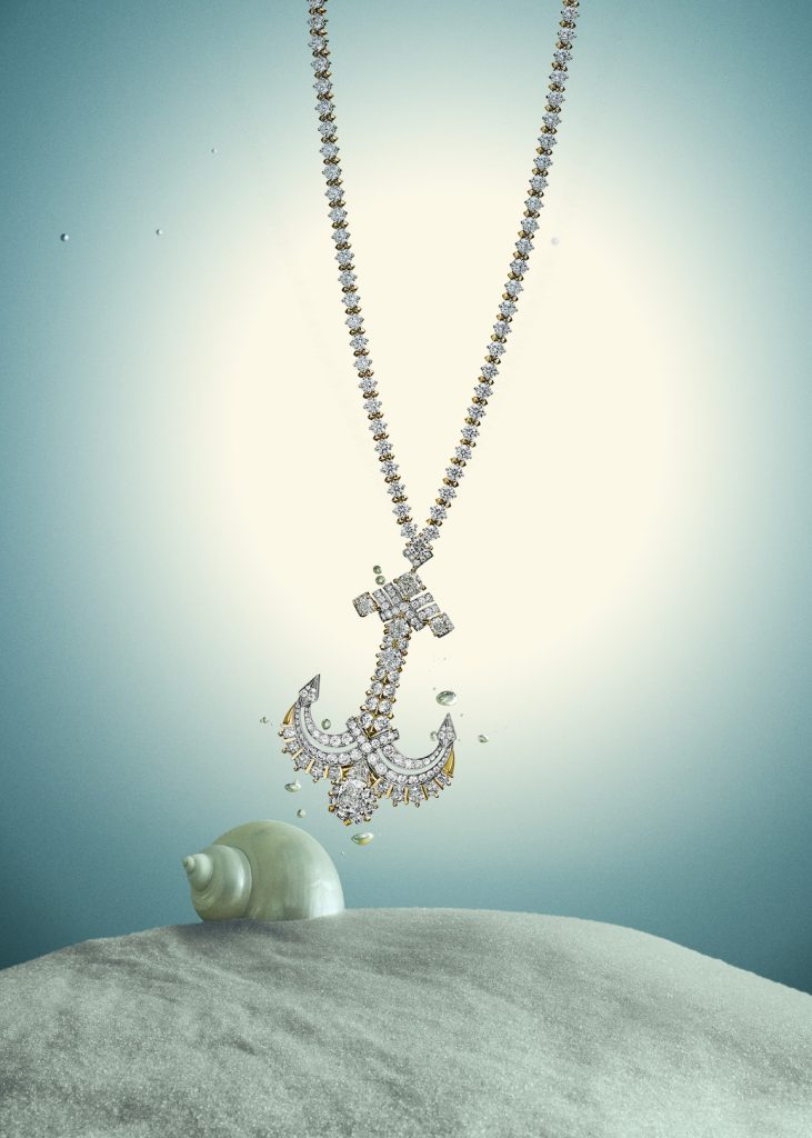 寰海星锚(Anchor)主题焕新诠释让·史隆伯杰于1939年创作的一款胸针作品,这件作品镶嵌红宝石、紫水晶及粉色蓝宝石,象征着力量与对称之美。该主题呈现全新吊坠、戒指及手镯设计,均采用枕形切割钻石为主石,以隽永几何美感奠定作品风格精髓。其中,铂金及18K黄金吊坠镶嵌一颗重逾2克拉的钻石,戒指与手镯则分别镶嵌一颗重逾5克拉和一颗重达1克拉的钻石,在颗颗钻石细节的点缀下,绽放璀璨光芒。