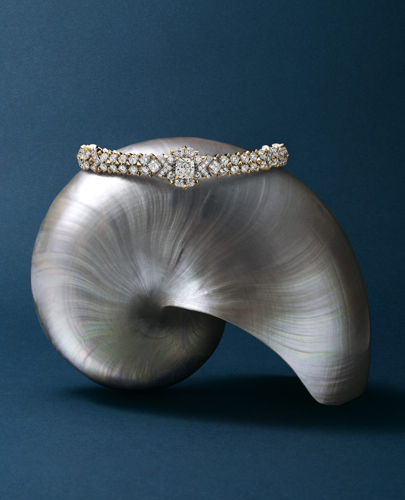 瀚海星螺(Shell)主题以对形态与肌理的双重礼赞,探索海洋的天然构造之美。作品以铂金、黄金勾勒蜿蜒起伏的曲线,钻石与黄钻镶嵌其间,再现贝壳自然“隆起”的形态,仿佛可以感知到海洋的律动。其中,一款精美胸针镶嵌一颗重达8.62克拉的绿色碧玺,生动展现了海螺壳不拘一格的不对称之美。