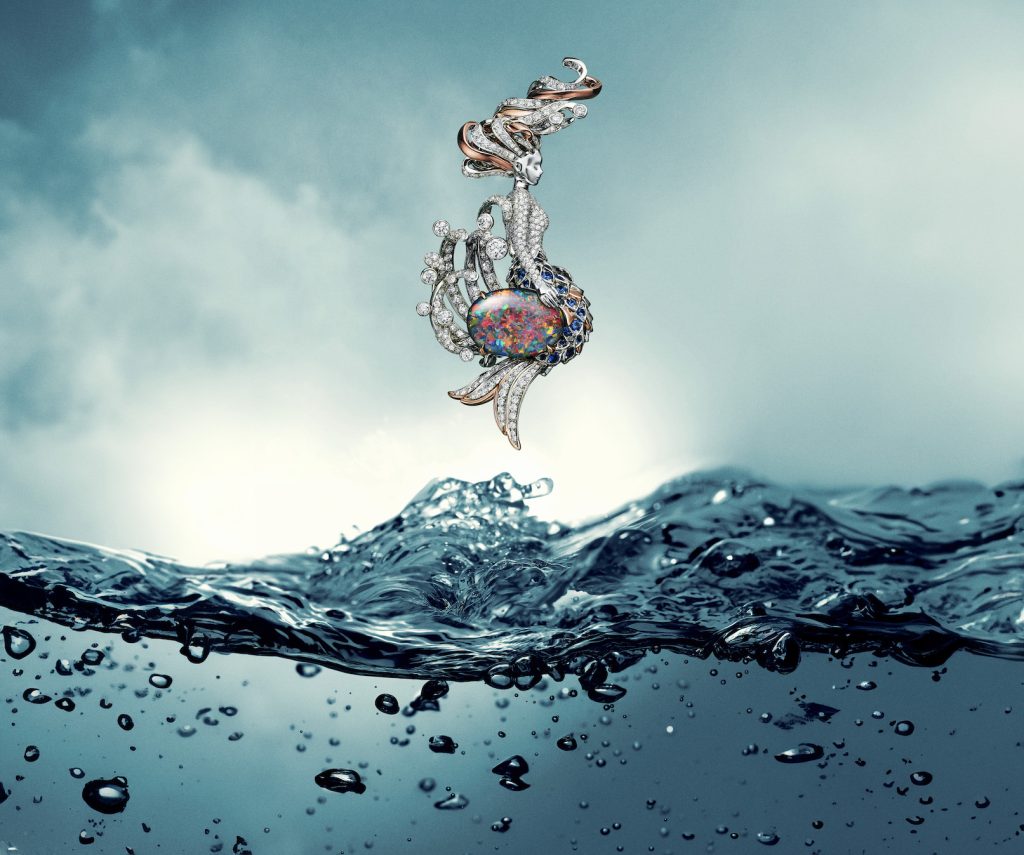 海灵仙姿(Mermaid)主题以传说中的美人鱼为灵感,通过Nathalie Verdeille极富想象力的视角,完美诠释这一神秘生灵的独特魅力。其中,一款以铂金与玫瑰金打造的镶钻胸针,生动勾勒出美人鱼的灵动身姿,鱼尾处则点缀一颗重逾10克拉的黑色欧泊。同时,该主题亦呈现多款造型丰富的戒指、耳环与项链作品,每件珠宝皆是对神秘深海的礼赞。