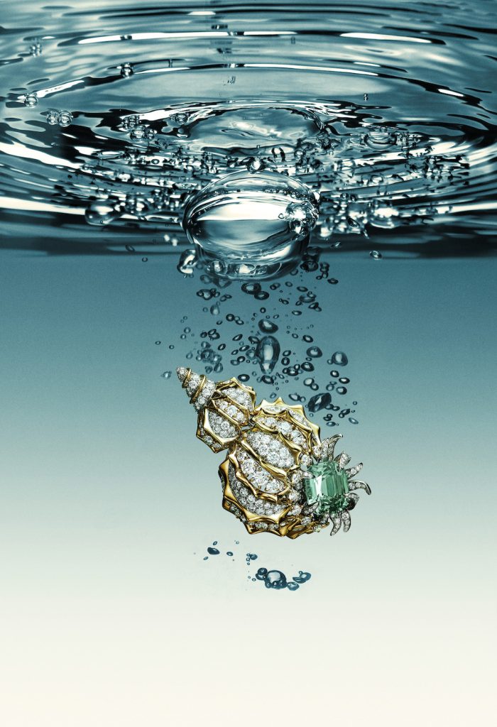 瀚海星螺(Shell)主题以对形态与肌理的双重礼赞,探索海洋的天然构造之美。作品以铂金、黄金勾勒蜿蜒起伏的曲线,钻石与黄钻镶嵌其间,再现贝壳自然“隆起”的形态,仿佛可以感知到海洋的律动。其中,一款精美胸针镶嵌一颗重达8.62克拉的绿色碧玺,生动展现了海螺壳不拘一格的不对称之美。